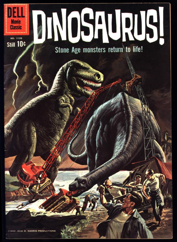 DinosaurusAdaptation of the 1960 movie "Dinosaurus." Painted cover art. Dinosaurus!, script by Eric Freiwald and Robert Schaefer, art by Jesse Marsh; Blasting in the harbor of a tropical island uncovers two frozen dinosaurs--a Tyrannosaur and a Brontosaurus; They are hoisted ashore and come to life after being struck by lighting; In addition, a prehistoric man washes ashore and he also comes alive with the lightning strike. Facts about five different dinosaurs. General facts about dinosaurs.