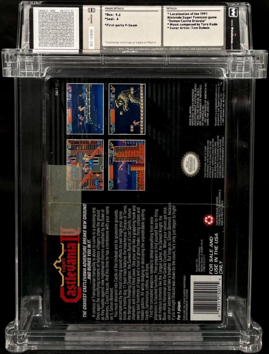 Localization of the 1991 Nintendo Super Famicom game "Demon Castle Dracula"; Music composed by Taro Kudo; Cover Artist: Tom DuboisTHE GRAVEST CASTLEVANIA ADVENTURE BREAKS NEW GROUND...AND BURIES YOU IN IT. A century of Transylvania tranquility is about to come to a shocking end. Once again the mortifying screams of helpless villagers shake the ground as they huddle against the new nightmarish horrors unleashed by the Duke of Darkness, Count Dracula. And this time he has a tombstone with your name on it Simon Belmont. You must descend into Castle of the Undead and it gruesome grounds, accompanied by the most chilling sound effects to ever tingle your spine. Inside, a freshly dug 11 level maze features the treacherous Terrance of Terror, the dangerous Rotating Dungeon, the Sunken Ruins of Lost Spirits, torture chambers and creature filled caves. Use your whip like a grappling hook and swing past hundreds of traps and a host of ghost freaks, living corpses and hidden goblins. All while dodging or destroying the unpredictable spitting lizards, carnivorous coffins, and more. Find the concealed weapons needed to defeat everything from eerie phantoms to haunted furniture. Then prepare to find yourself face-to-thing with hideous torments like the Tongue Lasher, the Darkest Knight, the Bone-Afide Horseman and the Granite Crusher. When your nerves get shot, use your password and take a breather. But forge on, Simon Belmont, because if you thought Dracula was down for the count, he's only just begun to fright!