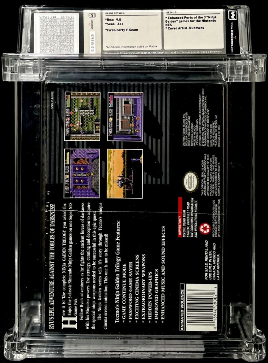 Enhanced ports of the 3 "Ninja Gaiden" games for the Nintendo NES; Cover Artist: RunmaruHere it is! The complete NINJA GAIDEN TRILOGY you asked for. Enjoy the 3 classic Nintendo Ninja Gaiden games on one Super NES Game Pak. Follow Ryu's adventures as he fights the ancient forces of darkness with his Ninjutsu power. Use strategy, cunning and deception to acquire the special ninja weapons needed to be successful in this epic quest. The Ninja Gaiden series tells it's story through Tecmo's unique cinema screen animation. This one is not to be missed!