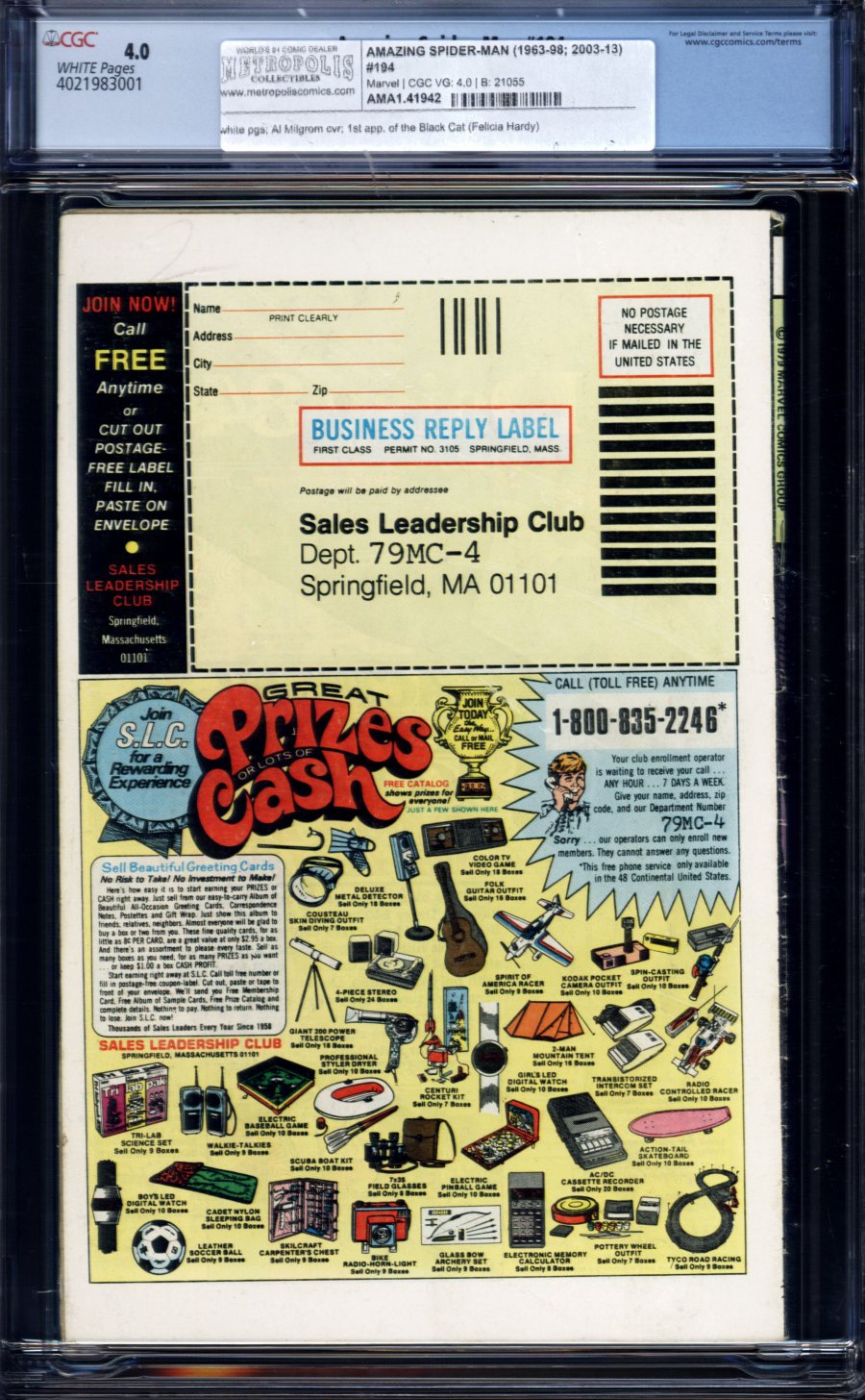 1st app of Black Cat (Felicia Hardy); Al Milgrom cover; Keith Pollard/Frank Giacoia art; Letter page includes an alternative cover for #194 and Spider-Woman #9 by Keith Pollard