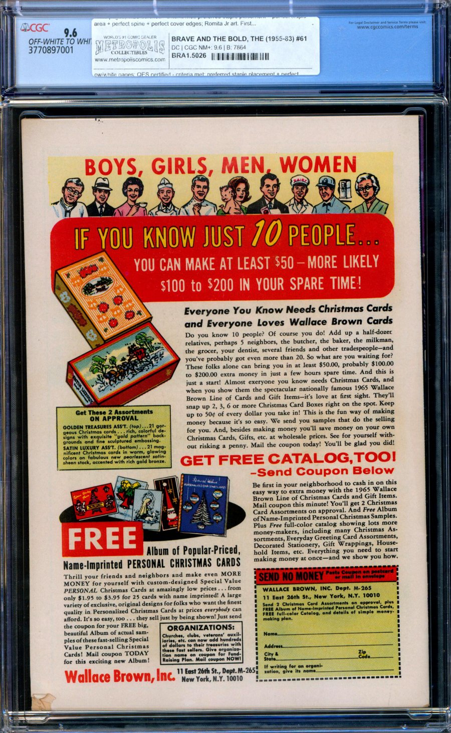 Anderson cover/art; origin Starman/Black Canary; COMIC BOOK IMPACT rating of 6 (CBI)The featured team up in B&B #61 is the unusual pairing of Starman, a throwback sci-fi hero from the Golden Age and Black Canary, another GA figure who has enjoyed success in the modern day thanks to her inclusion in DC's Arrowverse. The two heroes do battle with Starman's longtime enemy, the gaseous Mist, in this popular addtion to the beloved Brave and Bold series. Visit the
