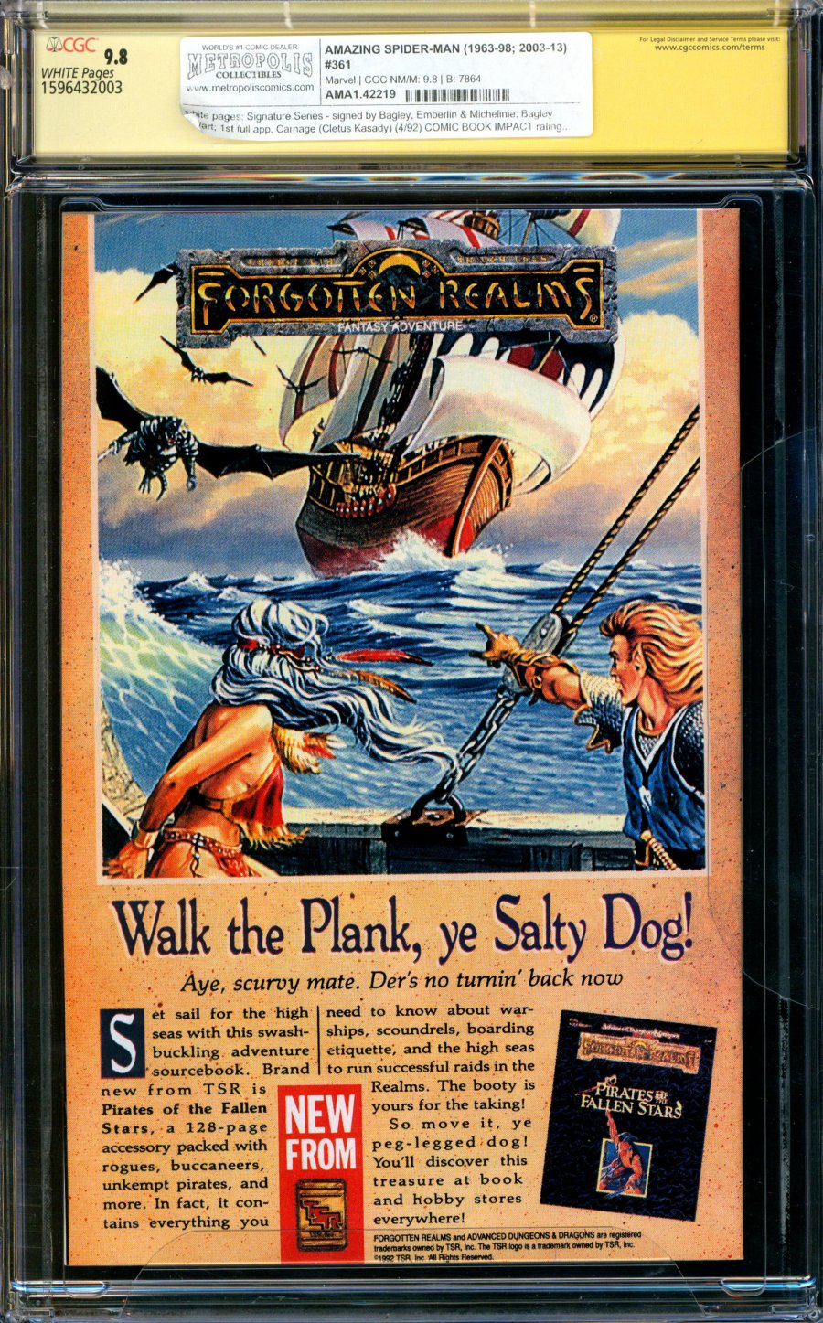 Mark Bagley cvr/art; 1st full app of Carnage (Cletus Kasady)Following a brief appearance in the pages of Amazing Spider-Man #359 Cletus Kasady/Carnage makes his first full appearance here in issue #361, marking a new chapter in the saga of the symbiotes. Carnage was initially conceived as a darker version of Venom, after the latter had become incredibly popular, Carnage essentially became a villain for a villain. Though relatively recently being introduced, the deranged killer imbued with superpowers immediately resonated among fans, becoming an overnight success. Unlike Eddie Brock, Cletus Kasady was a true criminal with zero morality, and his chaotic nature made a for stronger bond with his symbiote. As a result, Kasady was more powerful and deadly than his predecessor. Like Venom, Carnage has been showcased in multiple TV shows and video games, even earning an end credits cameo in 2018's “Venom.” Now Spider-Man aficionados have seen Carnage’s big screen debut in “Venom 2” adding to the value of this key issue.