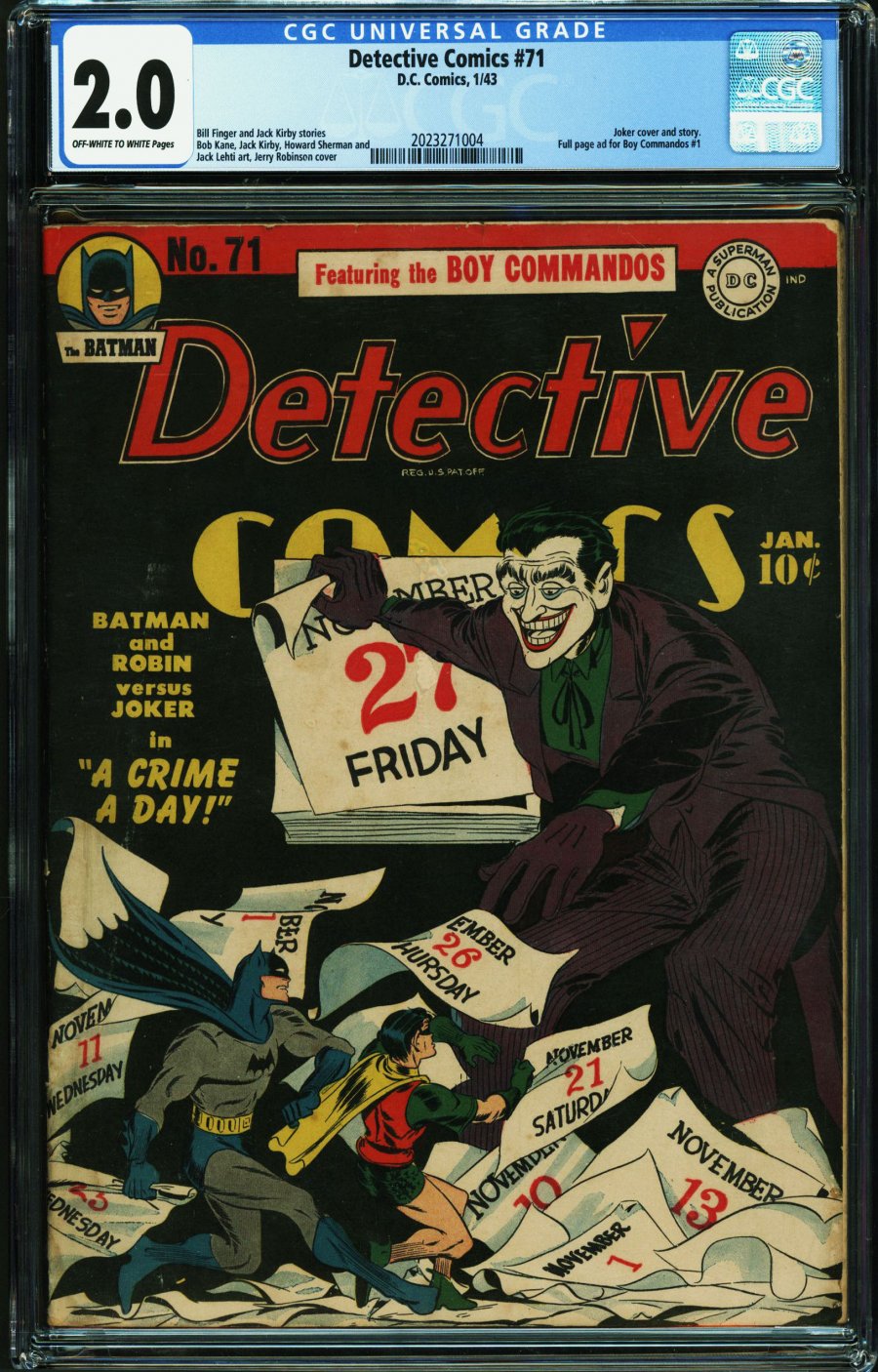 Joker covers are universally adored and Batman collectors are investing multiples of guide to win them at auction. The classic Detective Comics #71 from 1943 — beautifully illustrated by Joker co-creator Jerry Robinson — has the Clown Prince promising "A Crime a Day!" This issue of Detective Comics #71 also contains a Boy Commandos Christmas story by Simon and Kirby, and an ad for Boy Commandos #1.