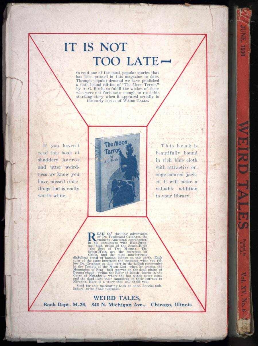 June 1930; Rankin cover; "The Moon of Skulls" - Robert E. Howard (part 1, Solomon Kane); "Rats in the Walls" - Lovecraft (reprint)
