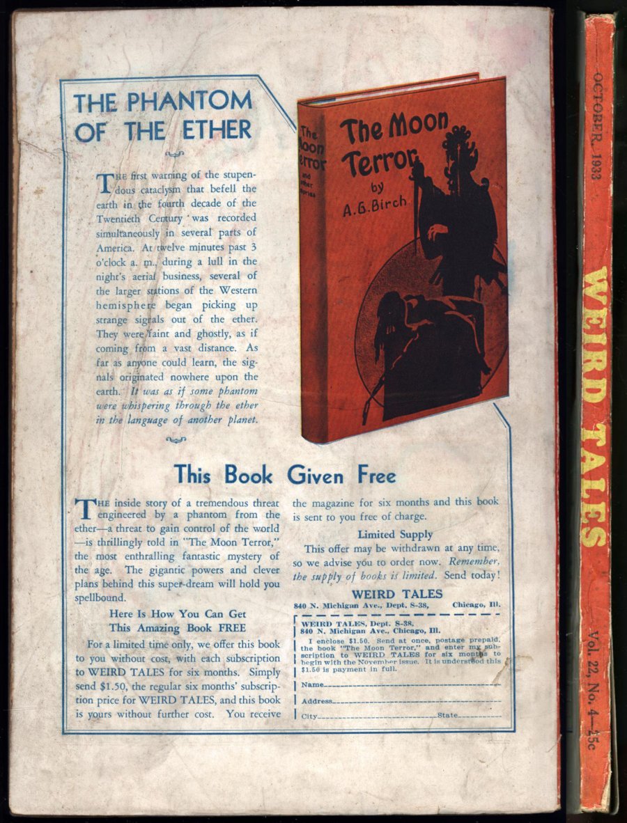 intact red spineThe October 1933 issue of Weird Tales is an absolute classic. This issue features an iconic Bat-Woman cover by Margaret Brundage. This striking cover shows why Brundage was the favorite artist for Weird Tales during it's original run. It is beautiful, Gothic, and spooky and stuck in the public consciousness for decades.