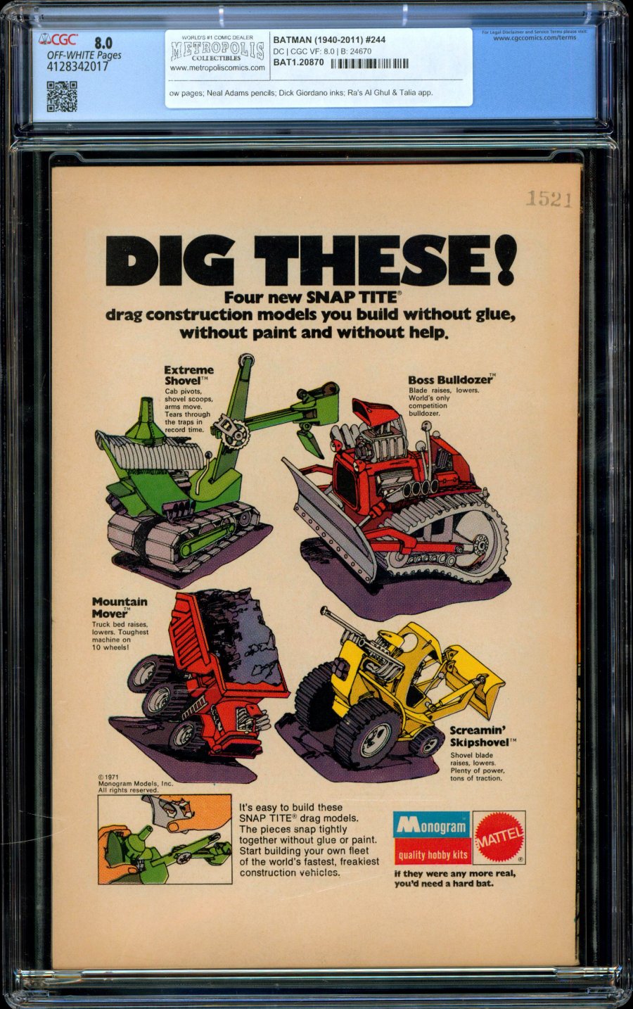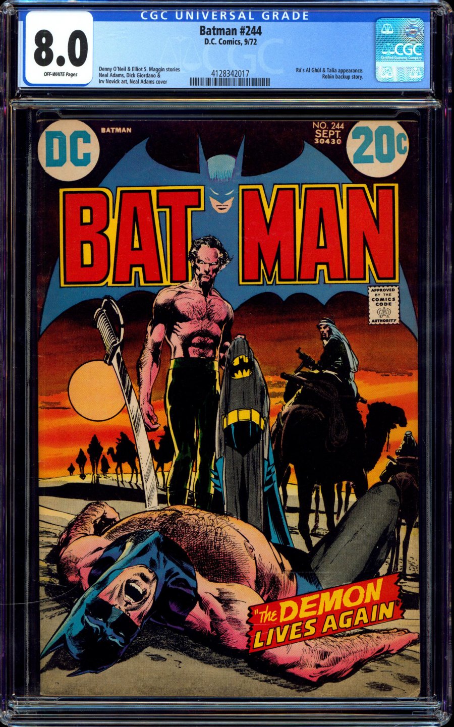 Neal Adams cover & art; Dick Giordano art; Ra's Al Ghul & Talia app; COMIC BOOK IMPACT rating of 7 (CBI)Ra's Al Ghul is back, and with a vengeance. Can Batman defeat the Demon in a one-on-one duel to the death? "The Demon Lives Again!" Talia appearance. Script by Denny O'Neil, pencils by Neal Adams, inks by Dick Giordano. Robin stars in the solo adventure "Teen-Age Trap!" Script by Elliot Maggin, pencils by Irv Novick, inks by Giordano.