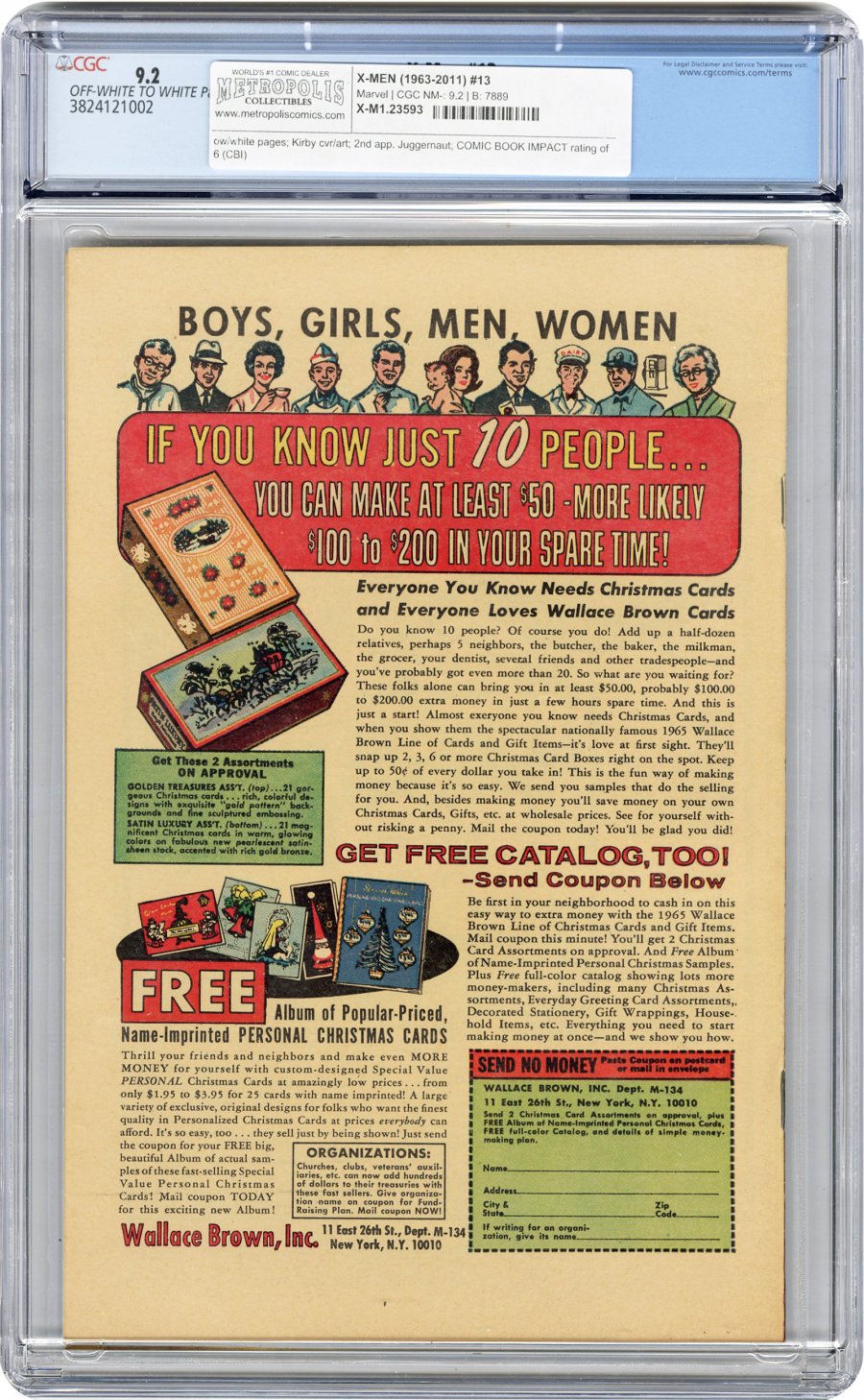Jack Kirby cover; 2nd Juggernaut; Matt Murdock cameo; COMIC BOOK IMPACT rating of 6 (CBI)Continuing the saga of the introduction of Charles Xavier's brother, the Juggernaut, this issue is basically a nonstop action-fest, an all-out melee between the X-Men and the brutal Juggernaut, whose helmet protects him from Professor X's mental powers. Calling on help from other heroes nearby, the Human Torch shows up in the nick of time to help the exhausted mutants, and they finally manage to subdue their enormous foe. Jean Grey tends to her battered and bruised compatriots after the battle, much to their pleasure. Featuring pencils by Kirby and Jay Gavin and inks by Joe Sinnott, this classic issue is a popular book with X-fans of all ages.