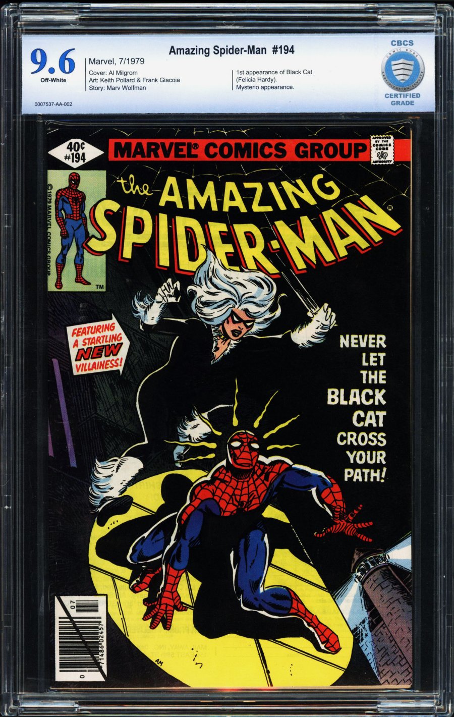 1st app of Black Cat (Felicia Hardy); Al Milgrom cover; Keith Pollard/Frank Giacoia art; Letter page includes an alternative cover for #194 and Spider-Woman #9 by Keith PollardFirst appearance of the Black Cat in "Never Let The Black Cat Cross Your Path!" Part 1 of 2. Script by Wolfman. Art by Pollard (breakdowns) and Giacoia (finishes). Cover by Milgrom. One of the landmark issues of the Amazing Spider-Man series. The dazzling debut of the Black Cat! The wall-crawler has spent the first 193 issues of his title chasing super-villains; but tonight he's going to kiss one instead! Wow! Does the web-slinger stand a chance against the beauty and charm of Felicia Hardy? Not when the alluring cat has his tongue. And maybe later his heart. A terrific issue! Cameo appearances by Aunt May, Betty Brant, Ned Leeds, Harry Osborn, Flash Thompson, Mysterio (in civilian clothes), and the burglar. Notes: The Black Cat is the creative highlight of the Wolfman-Pollard run on the Amazing Spider-Man title. Cockrum designed the cat's costume. The letters page includes an alternate cover (for issue 194) by Pollard. It also includes an alternate cover to Spider-Woman 9 by Infantino.