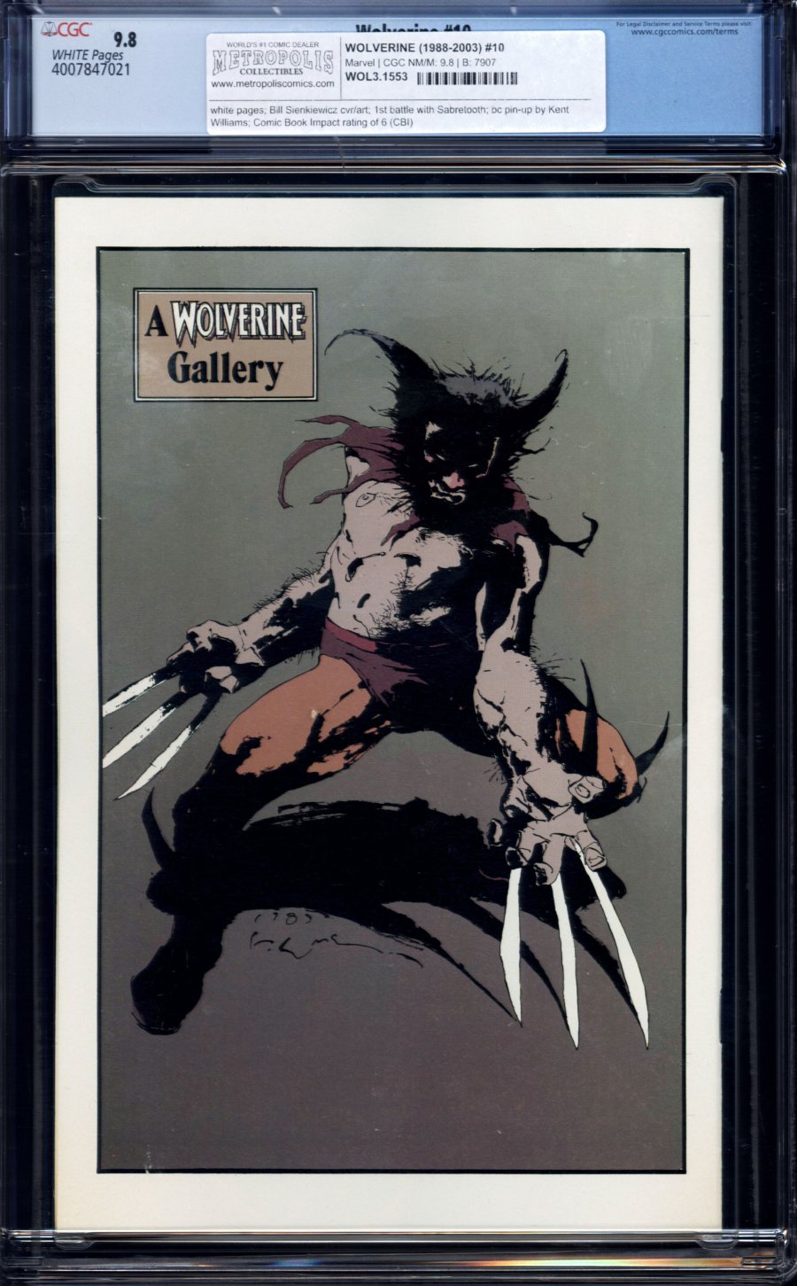 Bill Sienkiewicz cvr/art; 1st battle with Sabretooth; bc pin-up by Kent Williams; Comic Book Impact rating of 6 (CBI)