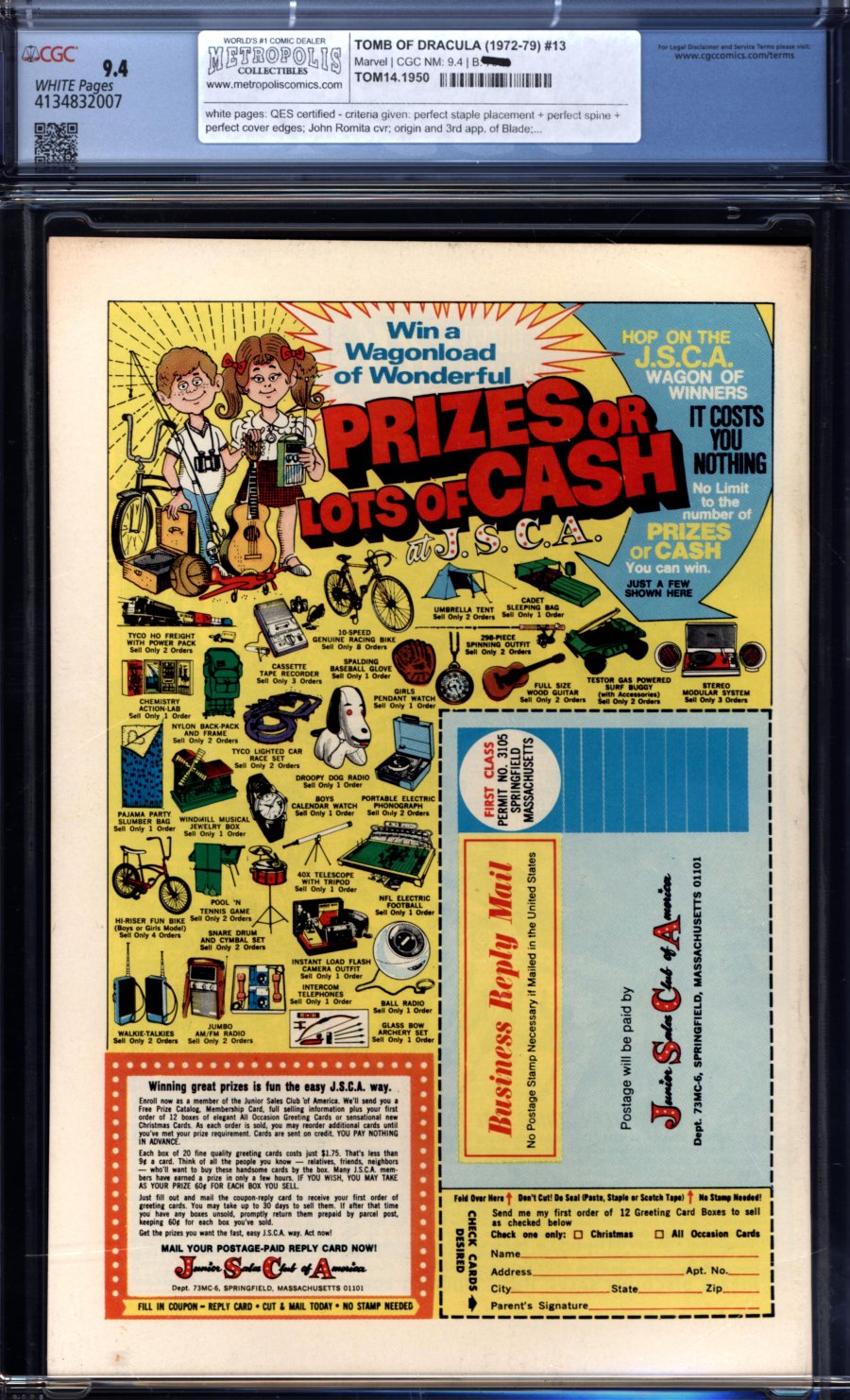 origin and 3rd app. of Blade; 1st cameo appearance of Deacon Frost, the vampire who bit Blade's mother; COMIC BOOK IMPACT rating of 6 (CBI)"To Kill a Vampire!" Written by Marv Wolfman. Art by Gene Colan and Tom Palmer. The slayers have finally tracked Dracula back to his layer, but can even this fierce team of vampire hunters destroy the most powerful vampire to ever stalk the earth? Plus, the origin of Blade!