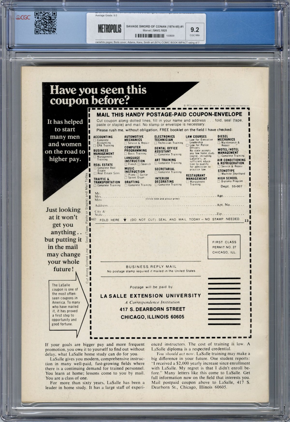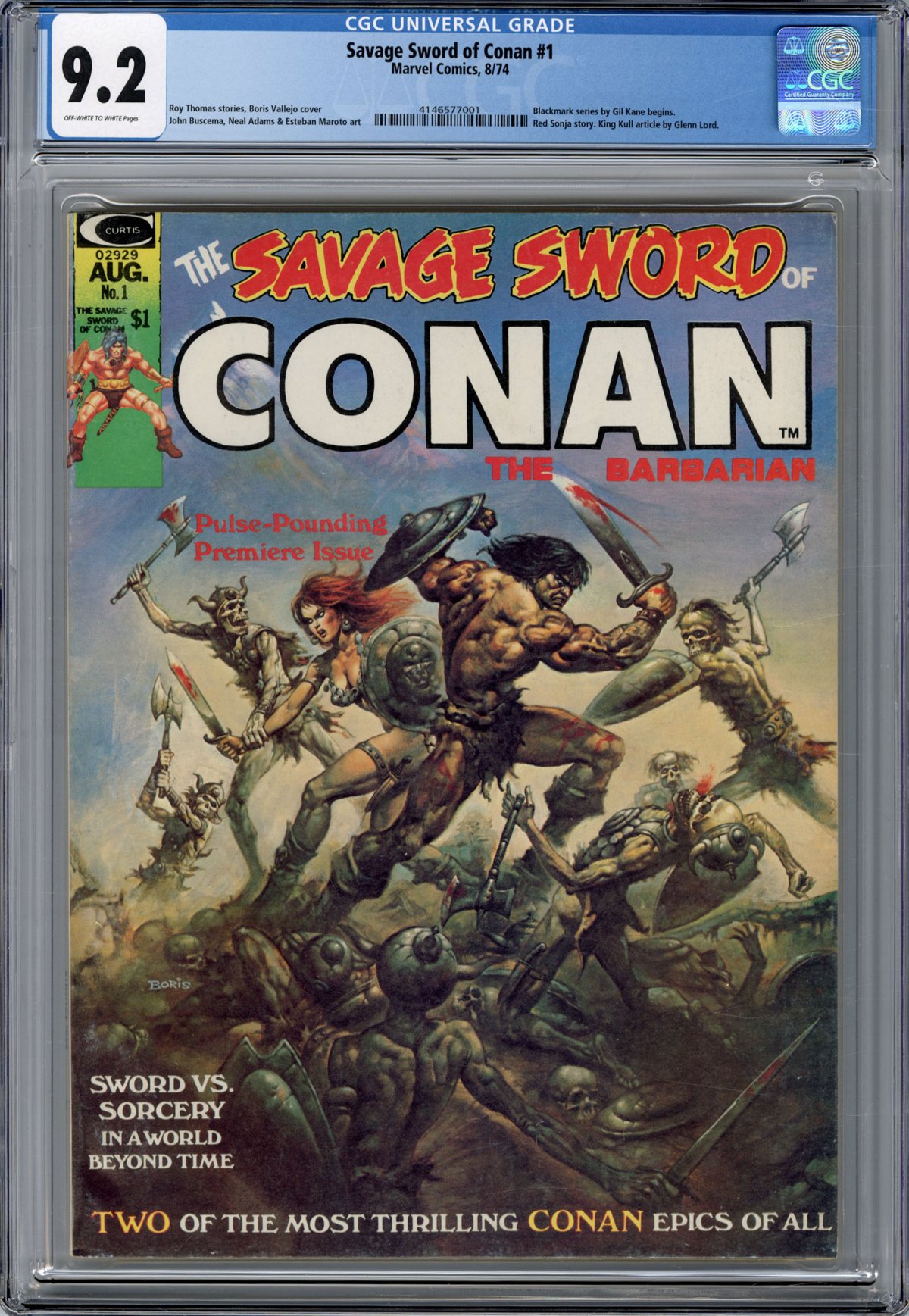 Boris cover; Adams, Kane, Smith art (8/74) COMIC BOOK IMPACT rating of 7 (CBI)The Savage Sword of Conan was a B&W magazine published by Marvel’s Curtis imprint starting in the 1970s and was far and away the most successful property in the magazine department at the House of Ideas. At the time magazines were allowed to contain more adult content, as long as they were the correct size and were predominantly black and white. Warren publishing was another entity that cashed in on the magazine fad that carved out a niche in the decade and led to more adult-themed full color mags like Heavy Metal eventually becoming accepted. Conan was already a successful comic book for Marvel so it must have been a no brainer to translate the ribald and violent adventures of the muscular barbarian into a more naughty and bloody affair. Running for well over 200 issues, the Savage Sword of Conan has a loyal cult following , the magazine was stuffed with tales of might and magic starring Conan and a variety of other fantasy heroes and heroines, plus there were plenty of amazing pin-ups by some of the best artists in the industry crammed into the pages. This first issue remains a popular collectible, and it features an adapted tale from the original Conan stories written by creator Robert E. Howard, it co-stars the lovely Red Sonja, and even includes some H.P. Lovecraft references. This book is an important piece historically which is a definite target for all Sword & Sorcery fans out there, a genre which is enjoying a renaissance at present thanks to Game of Thrones and other similar Fantasy films and TV programs.