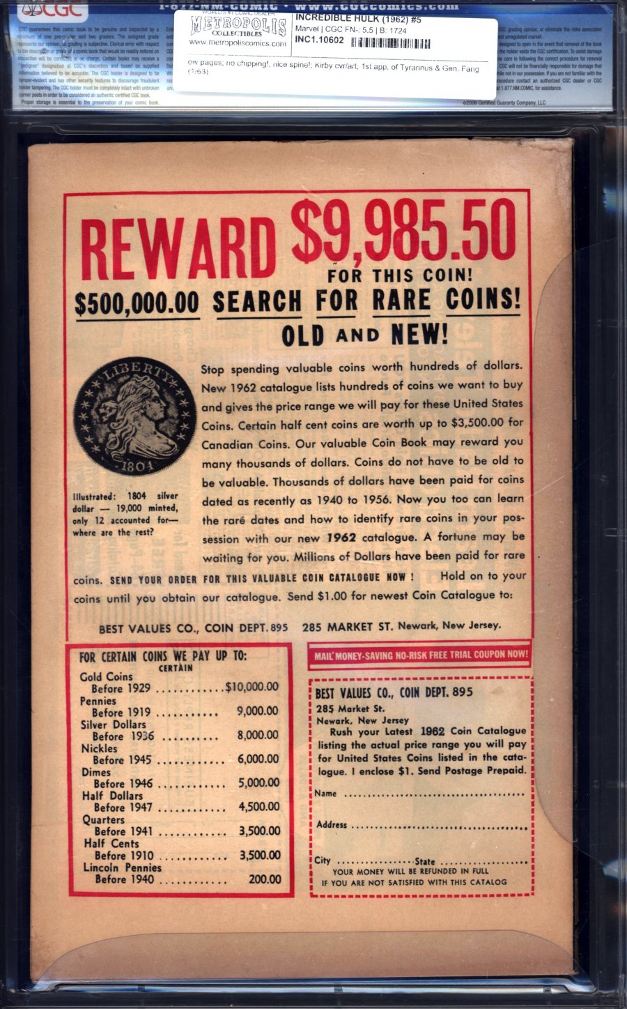 Kirby cvr/art; 1st app. of Tyrannus & Gen. Fang (1/63)Incredible Hulk #5 was the last issue of the original Hulk run drawn by co-creator, Jack Kirby, and it features a truly bombastic cover, showing the Green Goliath breaking through a concrete wall like it was a flimsy cardboard box. The stories contained within the rampaging cover see the Hulk doing battle with such illustrious Kirby villains as the Ancient Roman-styled Tyrannus and the fiendish commie General Fang. Needless to say, the duo of bad guys find out the hard way that it's not easy beating green, and are vanquished in smashing style by our Gargantuan Golem. MCU fans are eagerly awaiting the return of the Hulk and, typically, when a new Marvel movie is released, the comic market invariably sees an uptick in interest and value in the featured heroes.