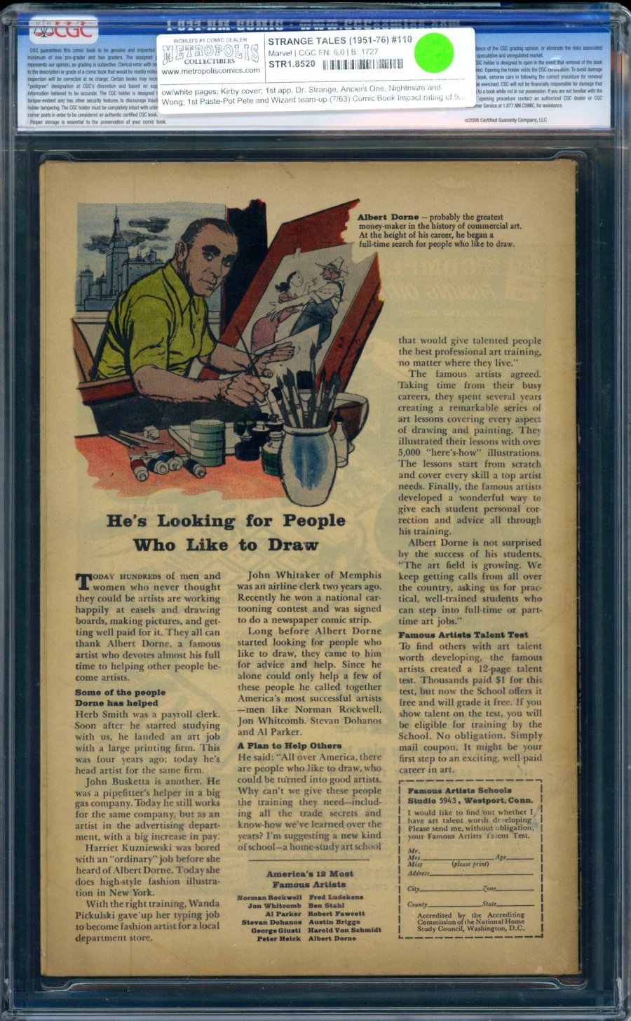 1st appearance Dr. Strange; 1st app. of Ancient One, Nightmare and Wong; Jack Kirby cover; 1st Paste-Pot Pete and Wizard team-up (7/63) COMIC BOOK IMPACT rating of 9 (CBI)