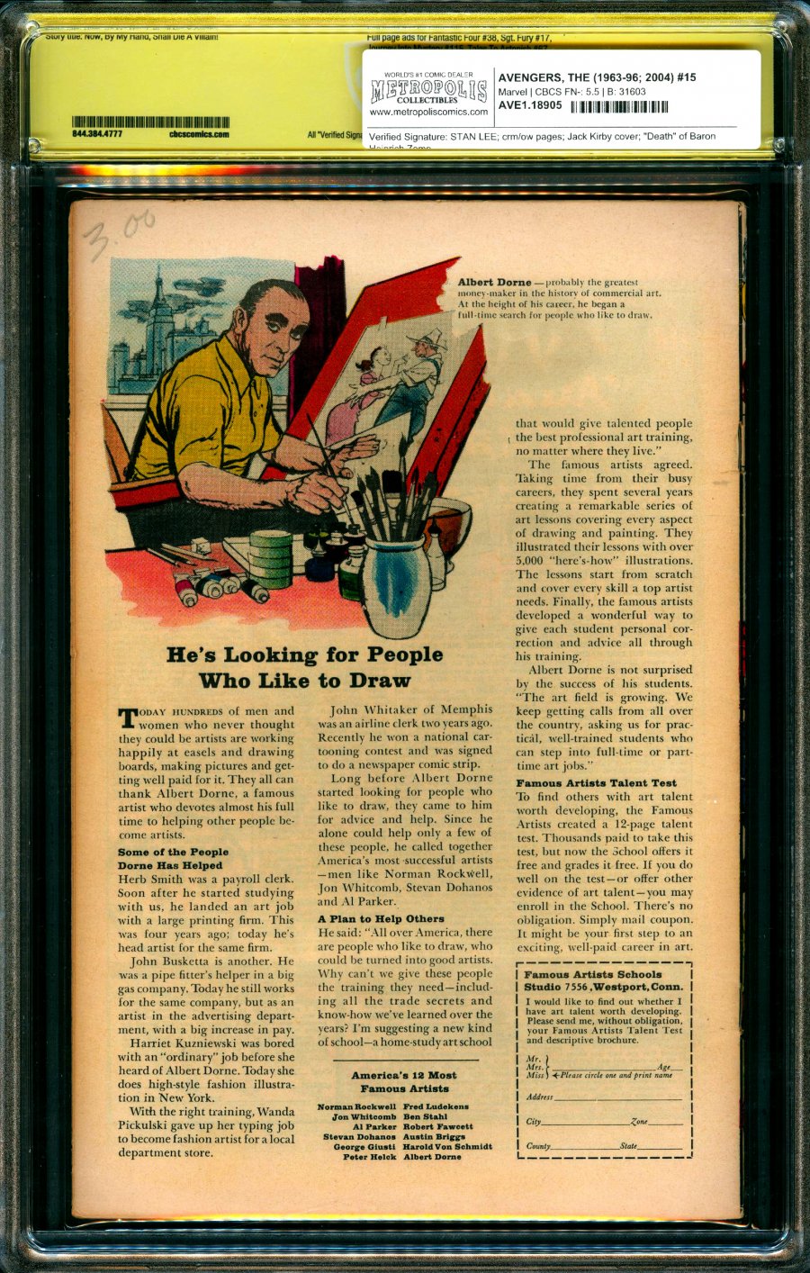 Jack Kirby cover; "Death" of Baron Heinrich Zemo; COMIC BOOK IMPACT rating of 6 (CBI)"Now, By My Hand, Shall Die a Villain!" Script by Stan Lee, layouts by Jack Kirby, pencils by Don Heck, inks by Mike Esposito (as Mickey Demeo). Avengers Roll Call: Thor, Captain America, Iron Man, Giant Man, Wasp, and Rick Jones. Villains: the first Baron Zemo, the Enchantress, the Executioner, the Melter, the second Black Knight, and the first appearance of Zemo's Mercenaries (Erik Josten). Baron Zemo is killed when a laser ray, he fires, reflects off of Captain America's shield and causes an avalanche that buries the baron underneath a ton of rock.Signed by Stan Lee!!