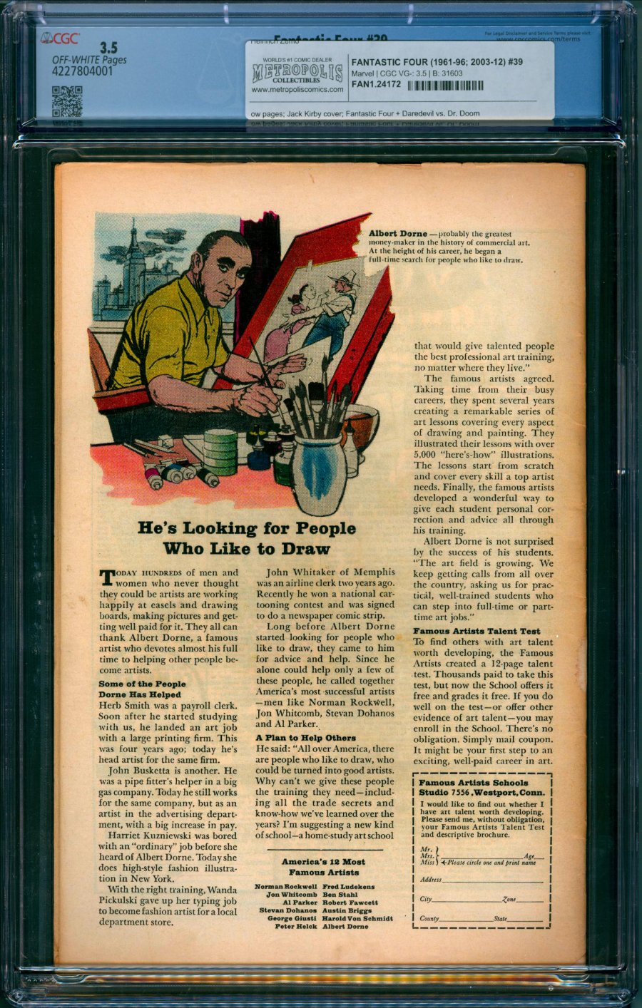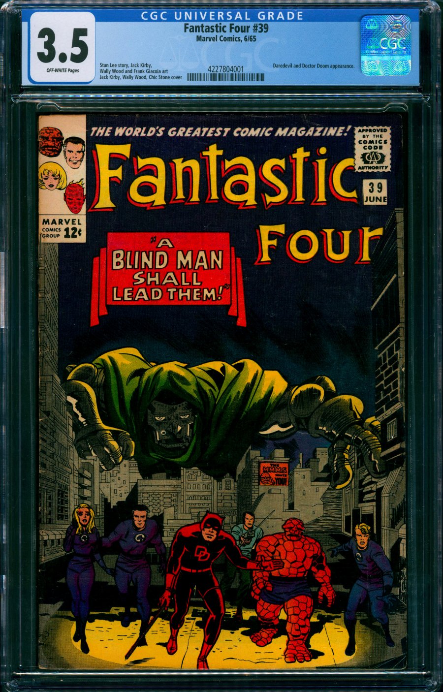 classic Jack Kirby cover; Fantastic Four + Daredevil vs. Dr. Doom; COMIC BOOK IMPACT rating of 7 (CBI)Wally Wood inks on Daredevil figure. A Blind Man Shall Lead Them!, script by Stan Lee, pencils by Jack Kirby, inks by Frank Giacoia [as Frank Ray] and Wally Wood (Matt Murdock and Daredevil figures); Reed devises mechanical devices to enable the FF to duplicate their vanished super-powers; Matt Murdoch visits the FF and Dr. Doom attacks; Daredevil assists the FF in battling Doom. Cameos by Medusa, the Wizard, the Sandman, and the Trapster.