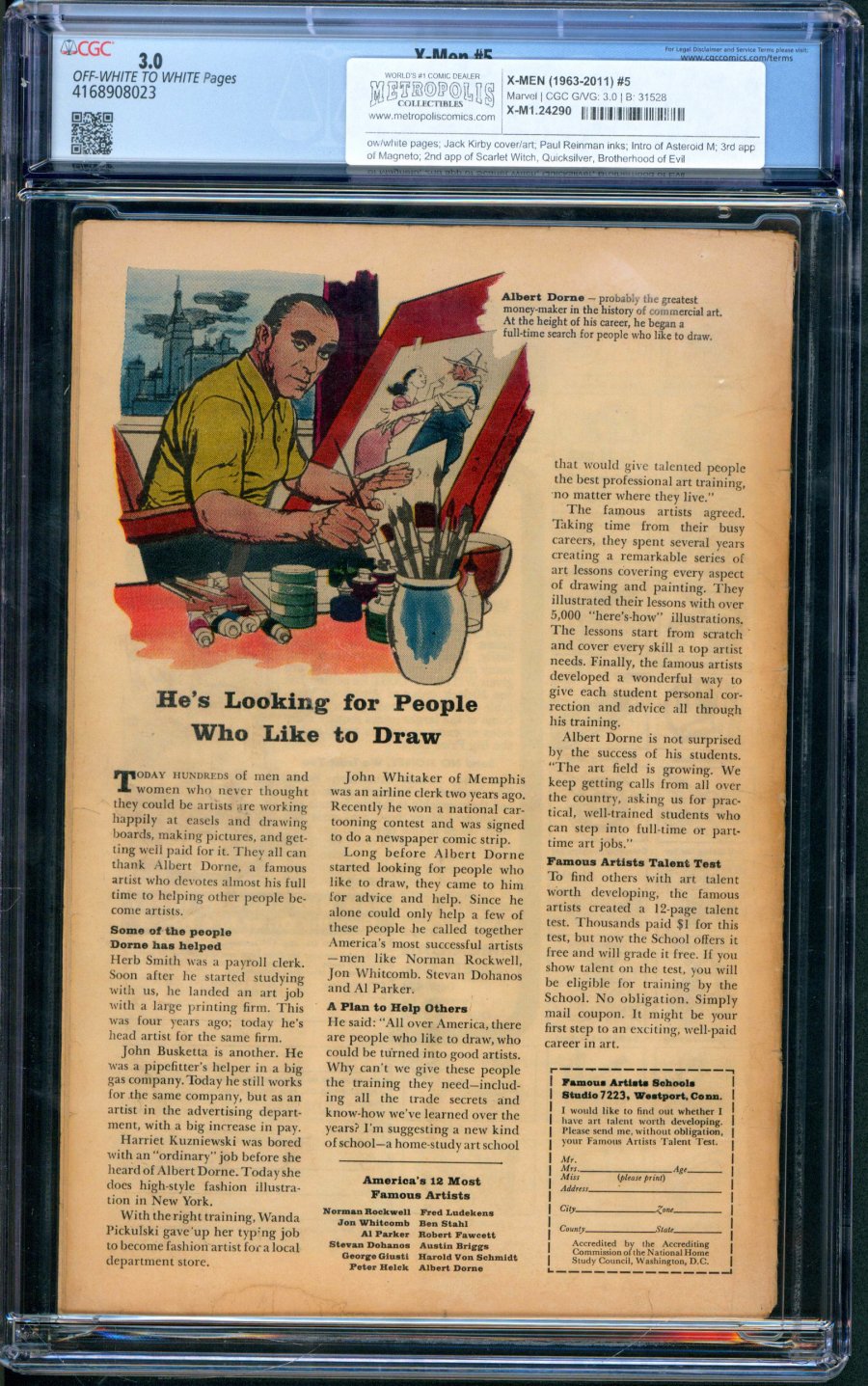 Jack Kirby cover/art; 3rd app of Magneto; 2nd app of Scarlet Witch, Quicksilver, Brotherhood of Evil; intro of Asteroid MX-Men #5 follows the youthful super-squadron through one of their many confrontations with their main nemesis, Magneto, and his Brotherhood of Evil Mutants. While investigating a potential mutant discovery, the X-Men stumble into a trap set by Magneto, but, his evil plot is thwarted by the Scarlet Witch, who is not willing to commit murder for her leader, foreshadowing her eventual conversion to the good side of the Marvel universe. After making a hair-raising escape from Asteroid M the X-Men return to their mentor, who is apparently pleased with their progress and informs them they have passed their finals and have graduated from the academy.