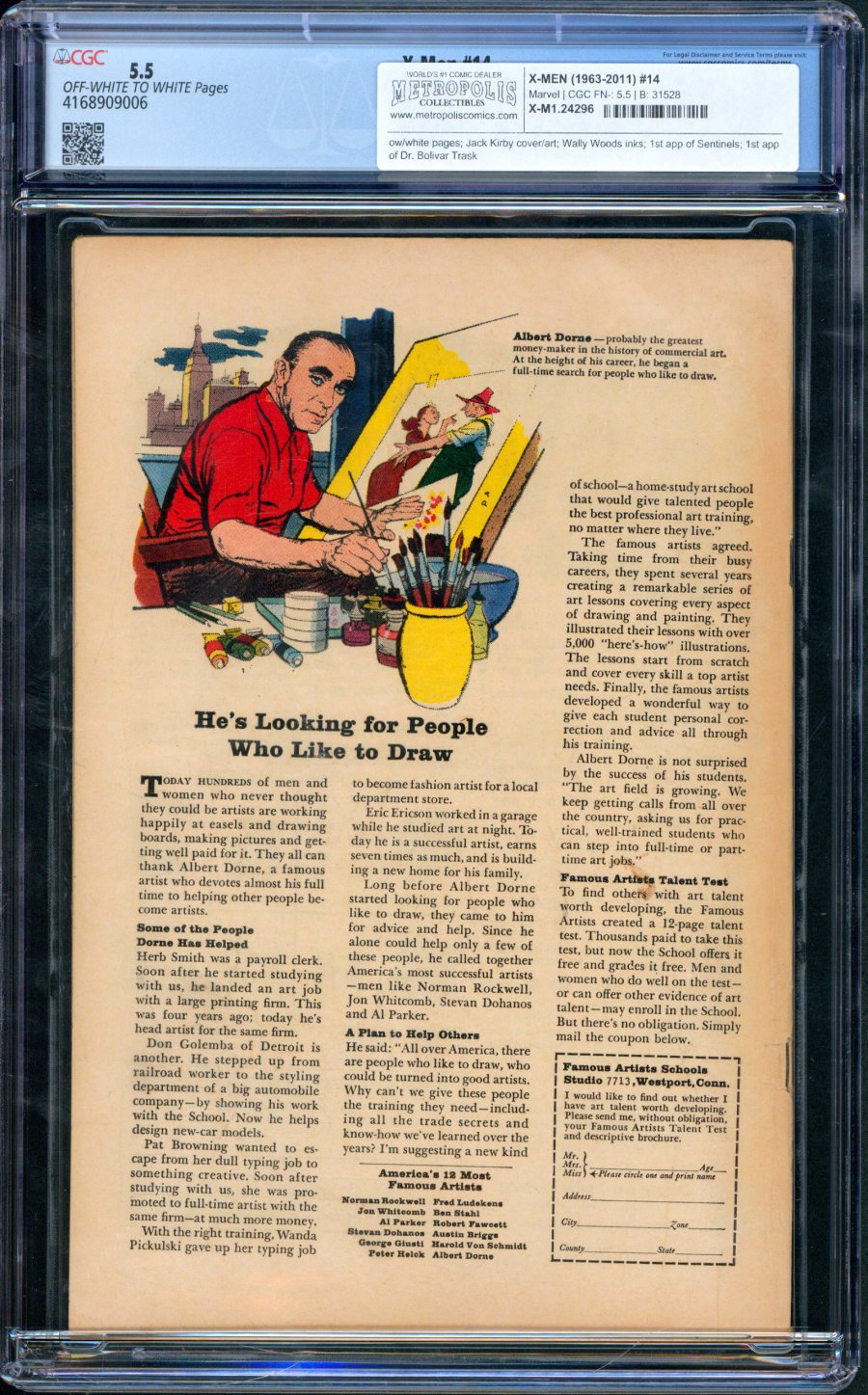 Jack Kirby cover/art; 1st historic appearance of Sentinels; 1st app of Dr. Bolivar Trask; COMIC BOOK IMPACT rating of 8 (CBI)X-Men #14 showed that the Marvel comic was still introducing legendary characters in the Silver Age—with the first appearance of both Dr. Bolivar Trask and his mutant-slaying robot army called the Sentinels. This timeless issue is mainly notable for Stan Lee and Jack Kirby adding a new dimension to the book's treatment of the X-Men as a persecuted race, with Trask funding the Sentinels by proclaiming mutants to be a threat to national security. These characters would all be major players in the X-Men's acclaimed big-screen franchise. Now, with Marvel Studios set to revive the teen mutant team, anticipation runs high for the Sentinels return to the Marvel Cinematic Universe.