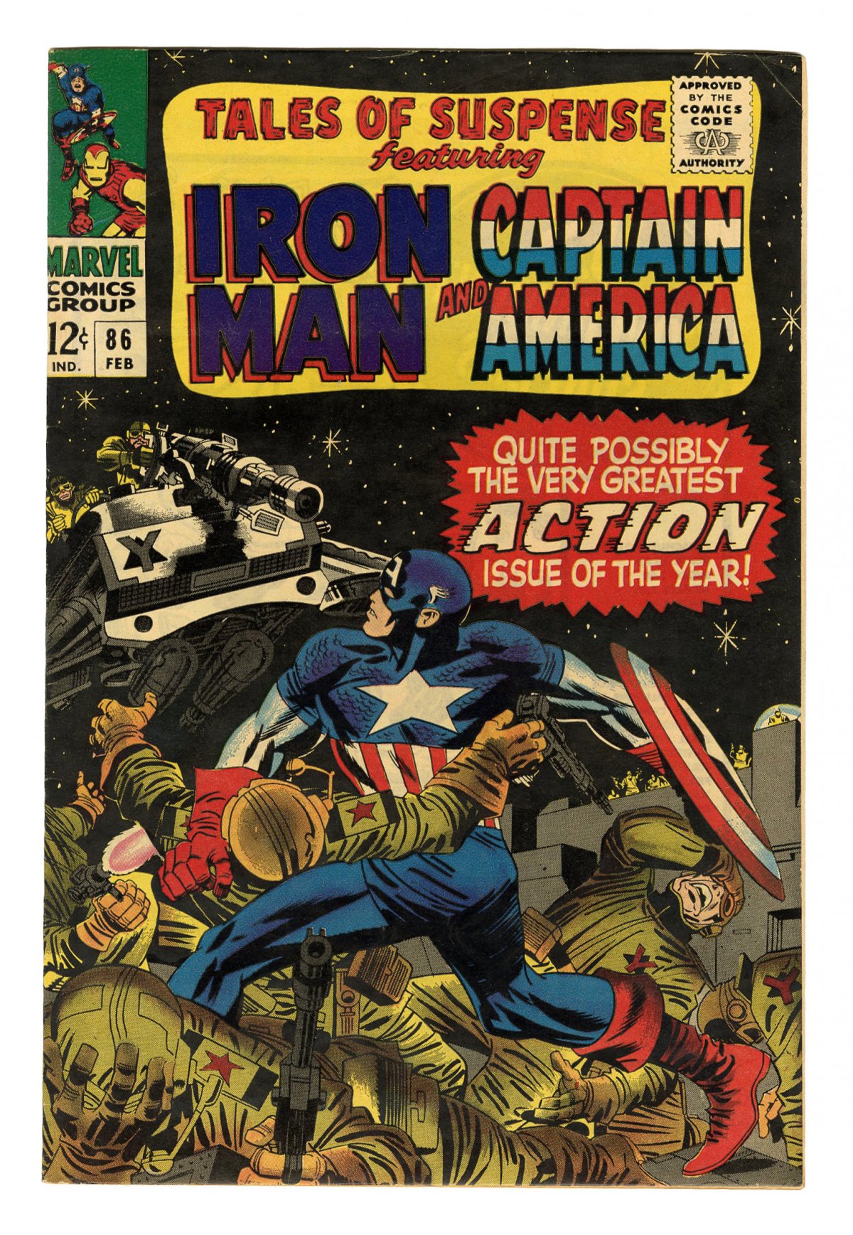 Jack Kirby cover/art + Gene Colin art; COMIC BOOK IMPACT rating of 6 (CBI)Possibly the best action issue of the whole TOS run! Classic Kirby Cap, fighting behind the Iron Curtain as only he can! And who can forget Iron Man's epic battle with The Mandarin!