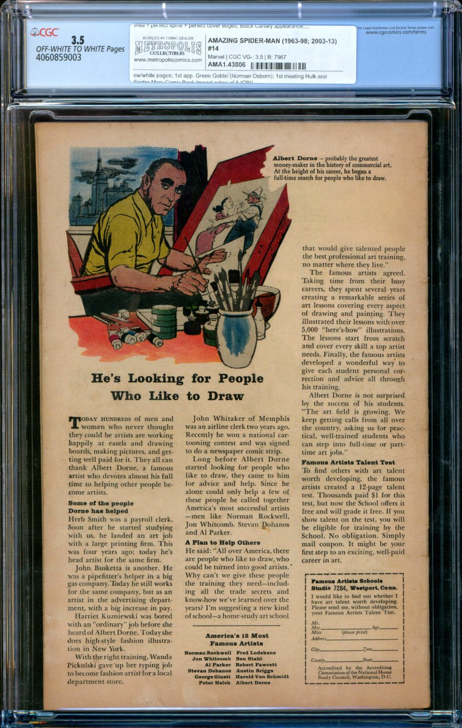 1st appearance Green Goblin (Norman Osborn); 1st Hulk meets Spider-Man; Steve Ditko cover & art; Comic Book Impact rating of 9 (CBI)