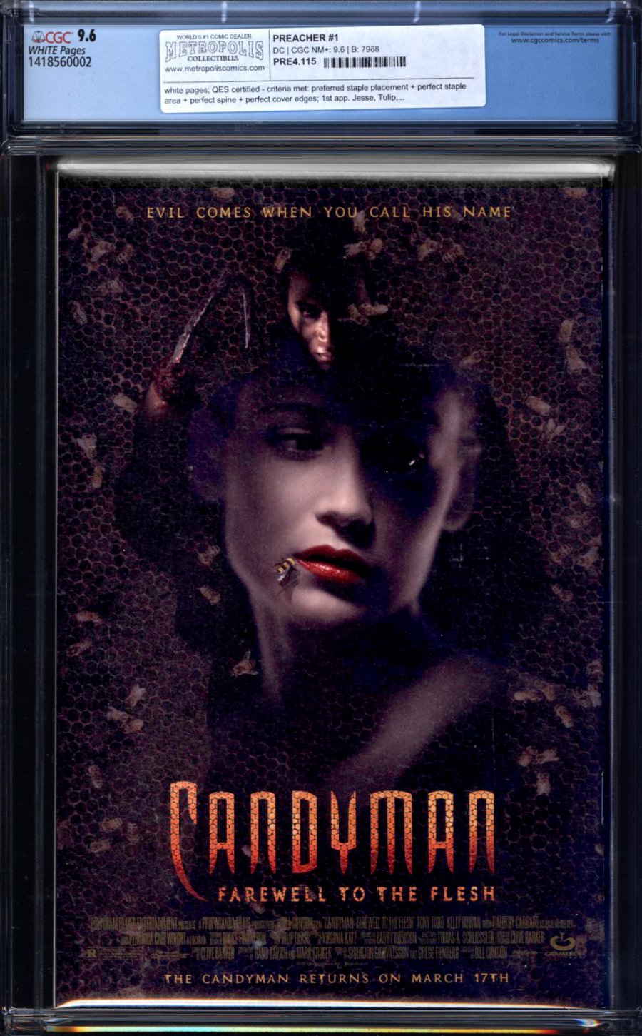 1st app Jesse, Tulip, Cassidy, Saint of Killers; Fabry coverCreated by writer Garth Ennis and artists Steve Dillon and Glenn Fabry, Preacher is a comic book released by Vertigo that tackles the very controversial topic of religion. Jesse Custer is a Preacher in a small town in Texas who becomes gifted/cursed with a power named Genesis, which is the ethereal form of the child born from the union of a demon and an angel, which is considered an abomination by God, who decides to step down from his throne and travel the Earth as a result. Custer is given the power to cause people to do his bidding simply by speaking commands to them, and, seeing as he is carrying one of the most potent forces in the universe around in his body, he himself may be the most powerful being on the planet. Along for the ride are Jesse’s ex-flame, Tulip, and a wisecracking Irish vampire by the name of Cassidy. The series was a limited run of seventy-five issues, sixty-six in the original run, and the balance is comprised of miniseries. The grandiose implications of the comic are tempered by the down and dirty everyday existences of the characters. After a couple of false starts at Miramax and HBO, Preacher was eventually adapted into a hit TV series on AMC, which is said to run four seasons, and has certainly made this introductory issue a bit of a hot property among the collecting crowd.