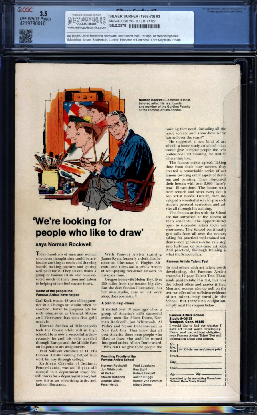 1st appearance of Mephisto. "The Power and the Prize!" Written by Stan Lee. The valiant Silver Surfer comes face-to-face with the sinister creature who would go on to become his greatest adversary and one of the greatest forces for evil in the Marvel Universe, Mephisto! When the Lord of the Underworld kidnaps Shalla Bal, Norrin Radd has no choice but to venture into the stygian depths and face the devil himself to save the woman he loves. Includes the Watcher back-up "Why Won't They Believe Me?" Story by Stan Lee. Art by Gene Colan and Paul Reinman. Letter to the editor from comic writer Tony Isabella. 68-page giant.