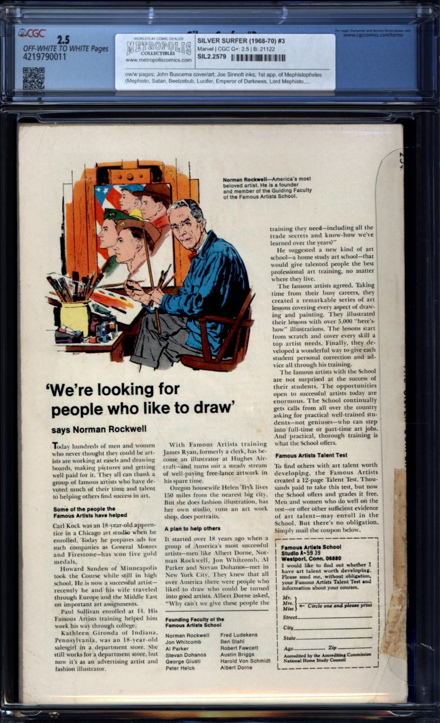 John Buscema cover & art; 1st app. of Mephistopheles (Mephisto, Satan, Beelzebub, Lucifer, Emperor of Darkness, Lord Mephisto, Roark, The Devil) COMIC BOOK IMPACT rating of 7 (CBI)1st appearance of Mephisto. "The Power and the Prize!" Written by Stan Lee. The valiant Silver Surfer comes face-to-face with the sinister creature who would go on to become his greatest adversary and one of the greatest forces for evil in the Marvel Universe, Mephisto! When the Lord of the Underworld kidnaps Shalla Bal, Norrin Radd has no choice but to venture into the stygian depths and face the devil himself to save the woman he loves. Includes the Watcher back-up "Why Won't They Believe Me?" Story by Stan Lee. Art by Gene Colan and Paul Reinman. Letter to the editor from comic writer Tony Isabella. 68-page giant.