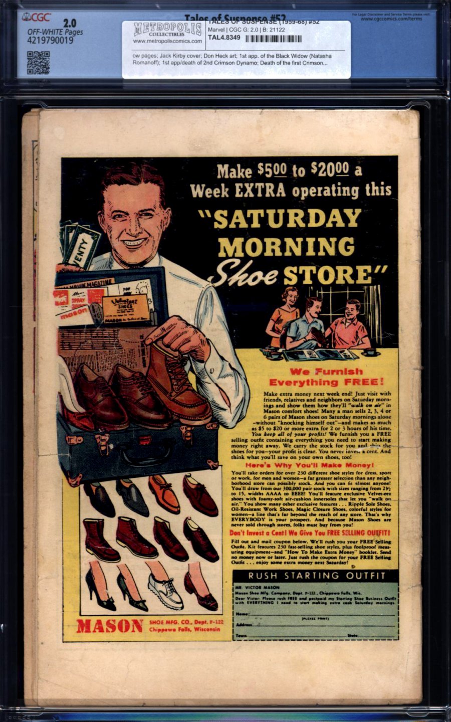 Jack Kirby cover; 1st app of the Black Widow (Natasha Romanoff); 1st appearance of 2nd Crimson Dynamo (and death); Death of the first Crimson Dynamo (Anton Vanko); COMIC BOOK IMPACT rating of 8 (CBI)