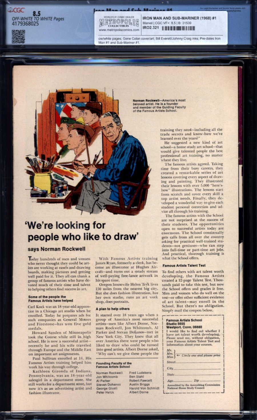 classic Bill Everett cover, pre-dates Iron Man #1 and Sub-Mariner #1; COMIC BOOK IMPACT rating of 7 (CBI)The cover boasts an action packed team-up between the titular heroes that never happens—so, you know, "don't judge a book by its cover." Instead this comic contains two separate stories continuing from Tales of Suspense and Tales to Astonish respectively; predating both Iron Man #1 and Sub-Mariner #1. With Iron Man's popularity peaking on the silver screen and Sub-Mariner's soon to come, this will undoubtedly be a highly sought-after issue for collectors and aficionados.