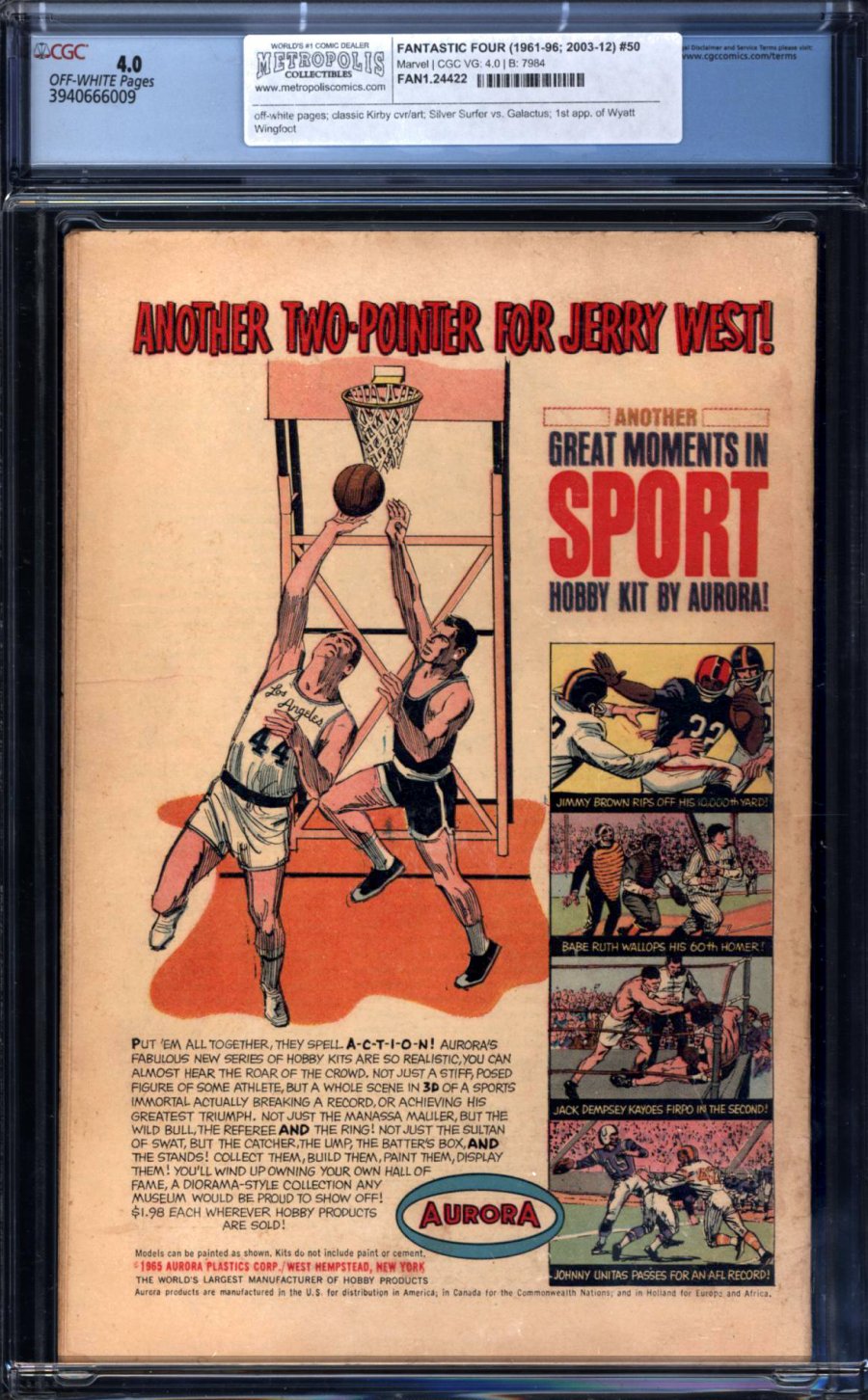 classic Jack Kirby cvr/art; Silver Surfer vs. Galactus; 1st app of Wyatt Wingfoot; Johnny Storm goes to collegeThe Surfer was famously dropped into his first appearance by Jack Kirby without warning his collaborator, Stan Lee, who was first bemused then intrigued by this bizarre and inventive new addition to the rapidly ballooning FF galaxy. By his third appearance in this landmark issue, Lee had solidified a tragic, Shakespearean arc for the new character, pitting him against his galactic master with the universe at stake and gracing him with tortured inner monologues and a questing spirit. The proof of the character's near-instantaneous acceptance with Marvel's increasingly college-aged readership is seen on this classic cover, where the upstart antagonist completely steals the focus from the book's supposed leads. Note the Thing's bewilderment at this unexpected turn of events.