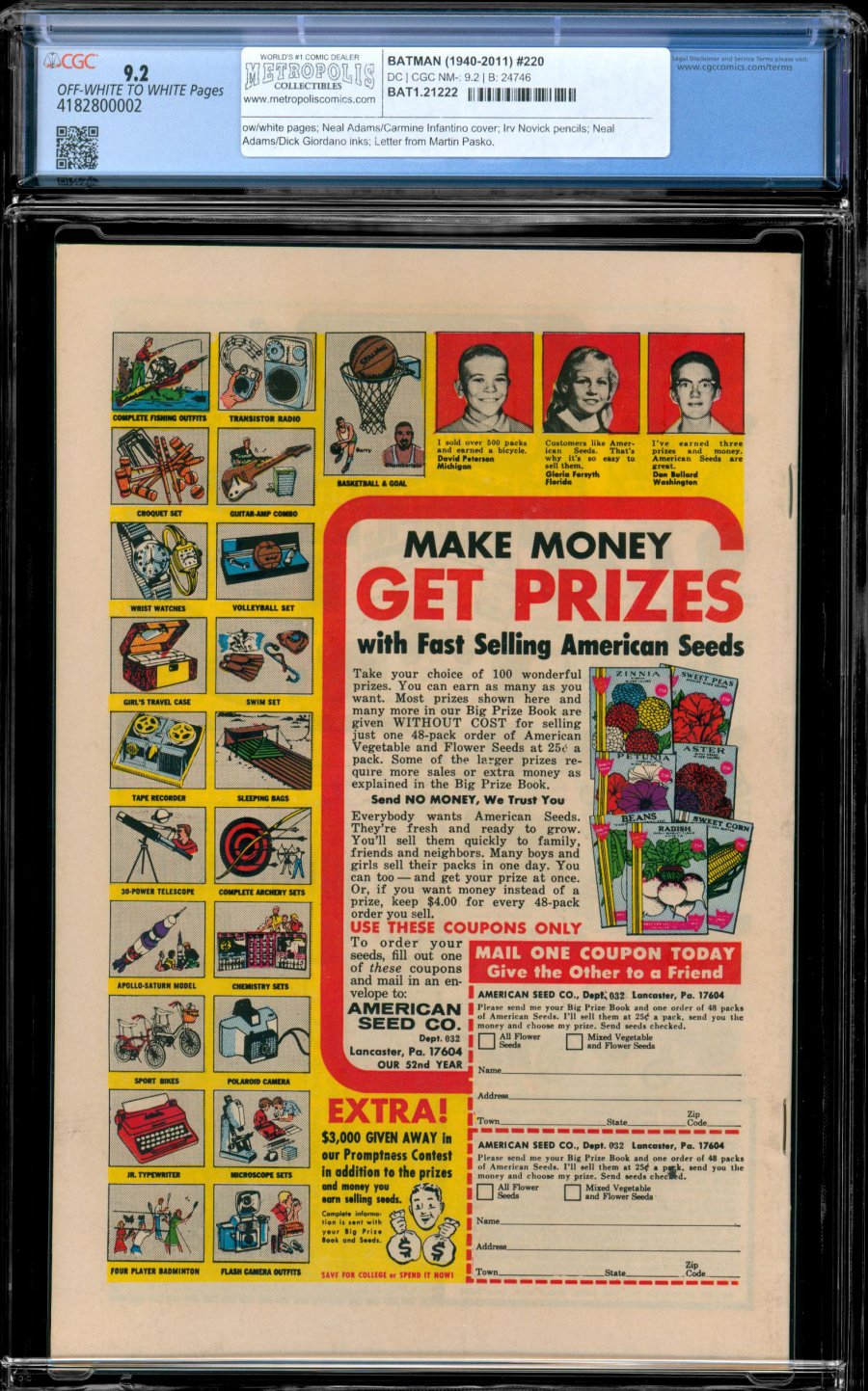 Neal Adams cover; COMIC BOOK IMPACT rating of 6 (CBI)Cover pencils by Neal Adams and Carmine Infantino (layout), inks by Neal Adams. "This Murder Has Been ... Pre-Recorded!", script by Frank Robbins, pencils by Irv Novick, inks by Dick Giordano; The murder of a construction company owner leads Batman to a plot by the killer to murder Marla Manning, a lady journalist investigating the crime; Manning first contacts Bruce Wayne, as she was the writer responsible for informing the people about the Wayne Foundation's Victims Program, and she had learned about the murder; Bruce promises her to contact Batman and later that night, he visits her and together they start investigating the case more closely; Batman contacts Commissioner Gordon about the case of Marla Manning's death threat; Batman follows the clues to a man called Nova