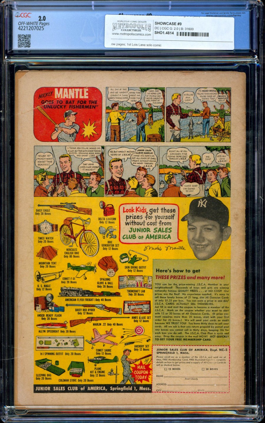 1st Lois Lane solo comic; COMIC BOOK IMPACT rating of 7 (CBI)When referring to Lois Lane's first lead appearance, one might look to the 70's feminist motto, "You've come a long way, baby." By 1957, Lois had indeed come a long way since accompanying the Man of Steel in Action Comics #1. Two decades later, Jerry Siegel and Joe Shuster's leading lady, love interest, and headline-hunting reporter for the Daily Planet commanded her own title spanning from March '58- Sept '74. As immortalized by the graceful, classy pen of Kurt Schaffenberger. Lois was an amalgamation of influences in the lives of her creators, including model Joanne Carter (who would later marry Siegel), and based on Torchy Blane, a smoldering sexy reporter portrayed in a popular series of 1930's films. With the beginning of the Silver Age, Superman's focus turned towards science fiction based storylines appealing to his predominantly young male readership. During this period Lois continued to vie for his affections, competing with her rival Lana Lang. Created by Bill Finger and John Sikela and first appearing in Superboy #10, Lang was Superman's teenage age love from Smallville and later a distant friend of Clark Kent. Lana appears in this issue and remains a frequent and important character well into the Modern Age, one of many Superman characters with the initials "LL." As a microcosm of American society, this first appearance, and subsequent issues, address the rapidly changing roles of women, marriage and divorce prior to the sexual revolution of the 60's. As iconic and lasting as Superman himself, Lois Lane has been his main romantic interest for the last three quarters of a century, and is to many the quintessential comic book girlfriend. This spin-off tryout comic is one of the scarcest of Superman keys and is a DC collectors hidden treasure.
