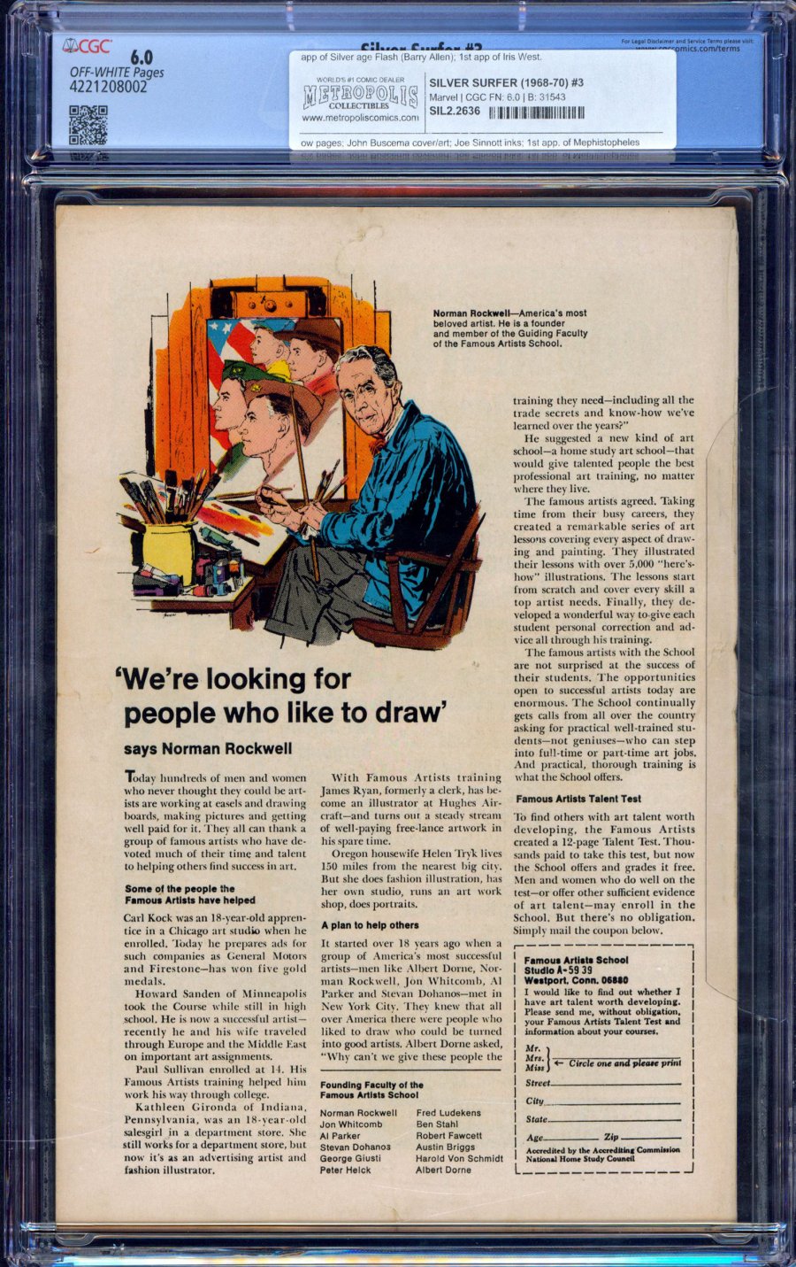 John Buscema cover & art; 1st app. of Mephistopheles (Mephisto, Satan, Beelzebub, Lucifer, Emperor of Darkness, Lord Mephisto, Roark, The Devil) COMIC BOOK IMPACT rating of 7 (CBI)1st appearance of Mephisto. "The Power and the Prize!" Written by Stan Lee. The valiant Silver Surfer comes face-to-face with the sinister creature who would go on to become his greatest adversary and one of the greatest forces for evil in the Marvel Universe, Mephisto! When the Lord of the Underworld kidnaps Shalla Bal, Norrin Radd has no choice but to venture into the stygian depths and face the devil himself to save the woman he loves. Includes the Watcher back-up "Why Won't They Believe Me?" Story by Stan Lee. Art by Gene Colan and Paul Reinman. Letter to the editor from comic writer Tony Isabella. 68-page giant.