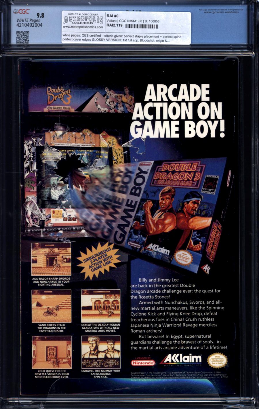 1st full app. Bloodshot; origin & 1st app of the new Rai, Harbinger and Solar app; Valiants are a smart investment for the future. Buy em up nowRai is the first original superhero published by Valiant Comics after the title’s humble beginnings as a flipbook back-up feature in Magnus Robot Hunter #5. Issue #0 includes the first full appearance of Bloodshot, a former assassin who gains a number of superpowers via nanite injections. After having his memory wiped, former mobster Angelo Mortalli was given the ability to control electronic devices and maximize his own physical capabilities to super-human levels. Readers were instantly receptive to the character and subsequently Bloodshot received his own title which is, in fact, the best-selling book for Valiant comics. Recently Bloodshot was featured in his own solo movie starring Vin Diesel as the titular character, with plans already set for a sequel down the road. With rabid fanbase, comic investors can expect the demand for this book to go up in value as Bloodshot is a huge success in multiple languages.