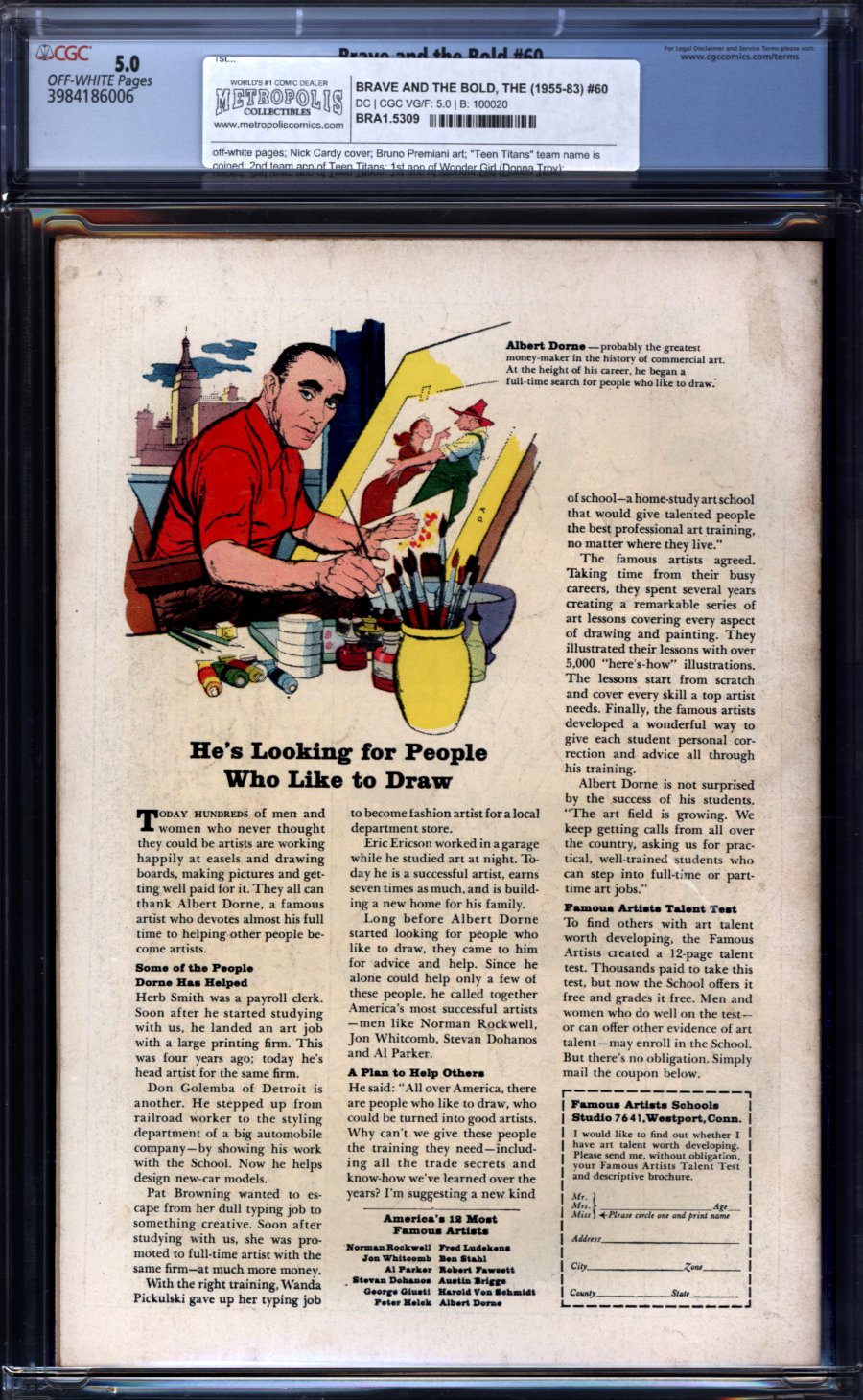 Nick Cardy cover; Bruno Premiani art; "Teen Titans" team name is coined; 2nd team app of Teen Titans; 1st app of Wonder Girl (Donna Troy); COMIC BOOK IMPACT rating of 7 (CBI)