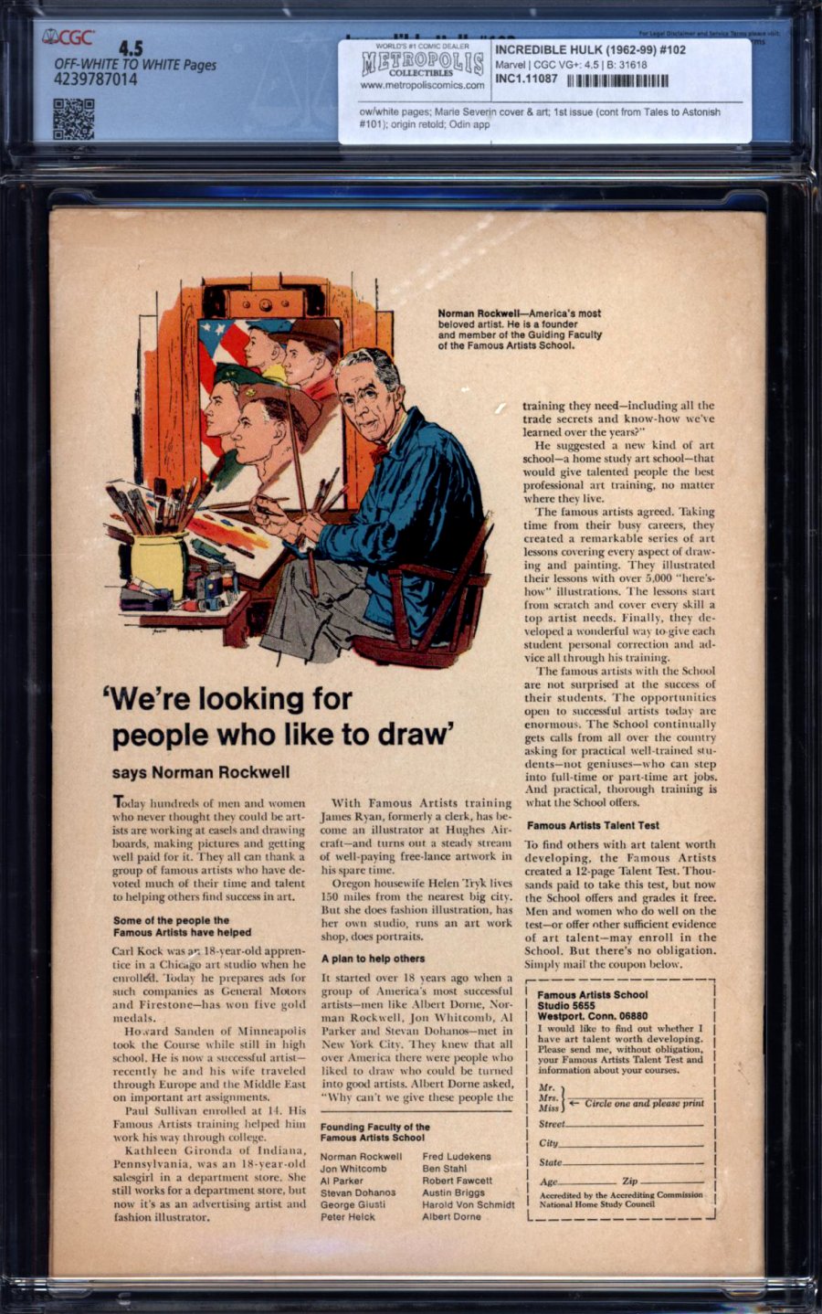 Marie Severin cover/art; 1st issue (cont from Tales to Astonish #101); origin retold; Odin app; COMIC BOOK IMPACT rating of 7 (CBI)