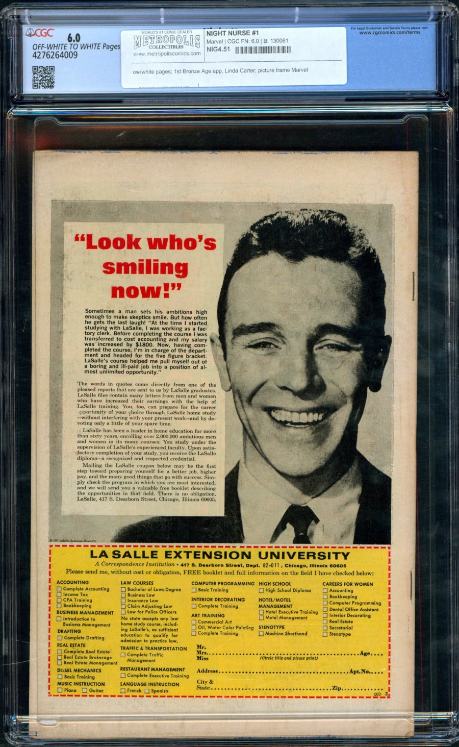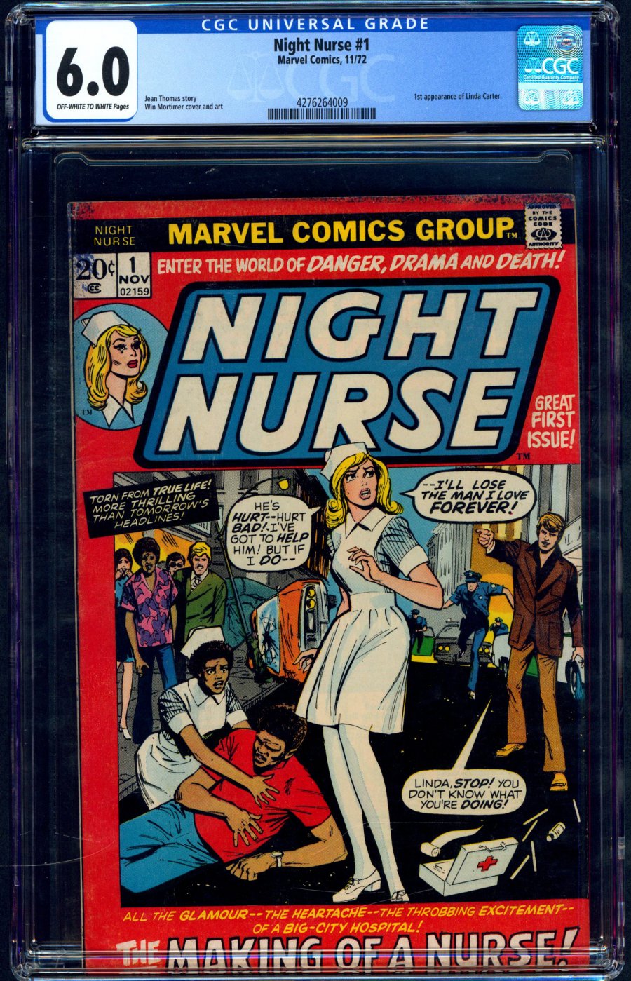 1st Bronze Age app. Linda Carter; picture frame MarvelConceived by Stan Lee as a way to appeal to female readers and try and broaden Marvel’s fanbase, Night Nurse was a romance/mystery title that only ran for four issues in the 1970s. The title was based on an earlier Atlas title, Linda Carter, Student Nurse, which was the inspiration for one of the trio of nurses featured in the sleeper hit. Reviving the concept in Daredevil V2 #58, Linda Carter returned as the Night Nurse, who was known around superhero circles to be sympathetic to the crimefighters need for anonymity which would prevent them from going to a hospital for assistance. Carter would attend to characters like Daredevil, Luke Cage, Iron Fist and others in secrecy, patching up their wounds so they could get back into the fray. The concept of the Night Nurse was incorporated in Marvel’s Netflix series in the personage of Claire Temple, portrayed by Rosario Dawson, whose appearances acted as a bridge between several characters that would later team up to form TV’s Defenders. This comic has become something of a minor league key since the introduction of the character in the popular streaming shows. Whether or not the book was the inspiration for the title of Gregory Isaacs’ romantic reggae hit of the same name, remains a mystery.