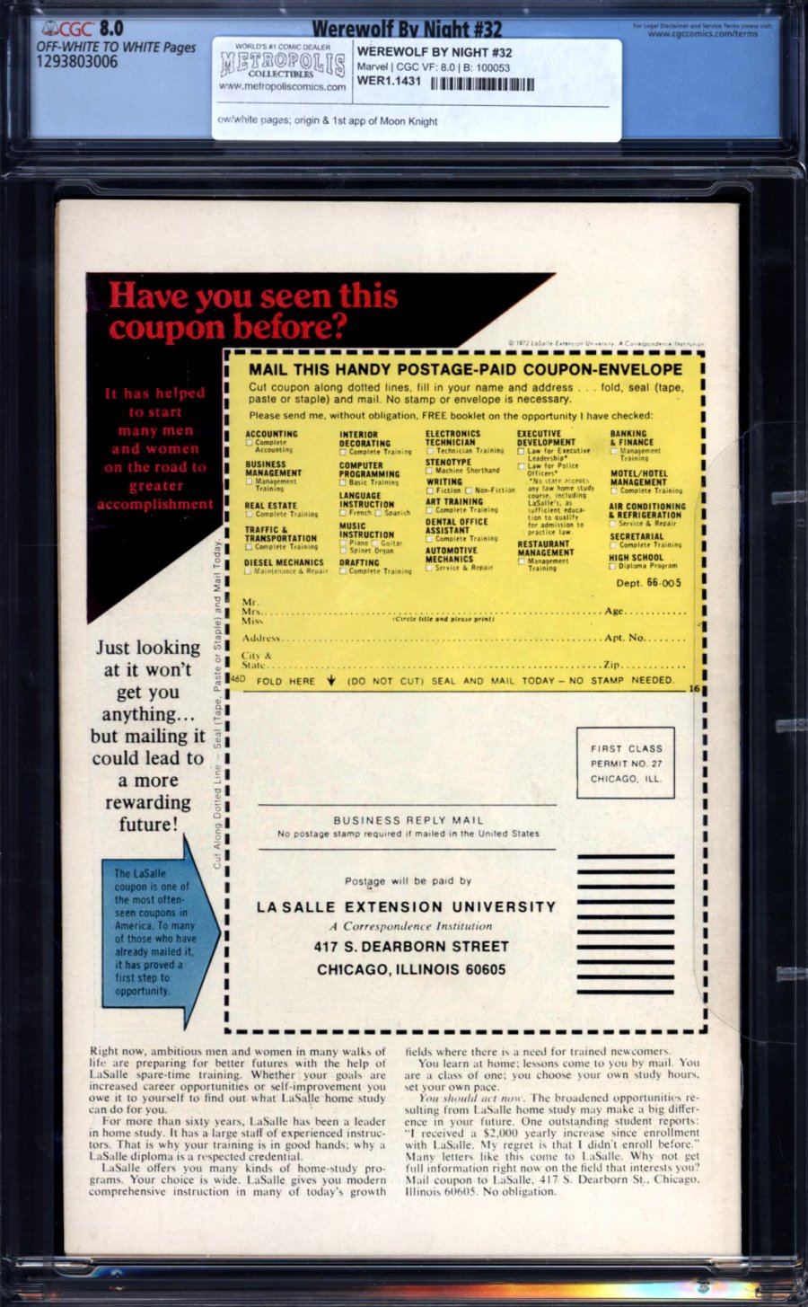 origin & 1st app of Moon Knight; COMIC BOOK IMPACT rating of 8 (CBI)While a fan favorite through most of the 1970s, few cared about Jack Russell by the 80s. In this issue, the lovable lycanthrope's nemesis, the mystical Moon Knight, made his debut and quickly became an enduring part of the Marvel mythos and a staple of direct sales titles. Compelling stories by Doug Moench (co-creator of the character, along with Don Perlin) made Moon Knight a keeper. With numerous titles featuring the Moon Knight prominently over the decades following his initial appearance, the Fist of Khonshu is still a huge draw for comic fans. The Moon Knight TV series for Disney+ should alert collectors to the fact that high-grade copies of Werewolf By Night #32 are exceeding multiples of price guide values.